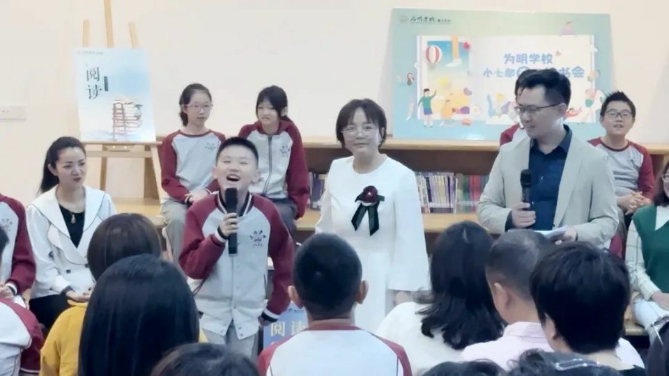 教育发展中心主任万勇,小七元培班负责人兼(1)班班主任陈瑜,以古今读书人的故事作读书动员: