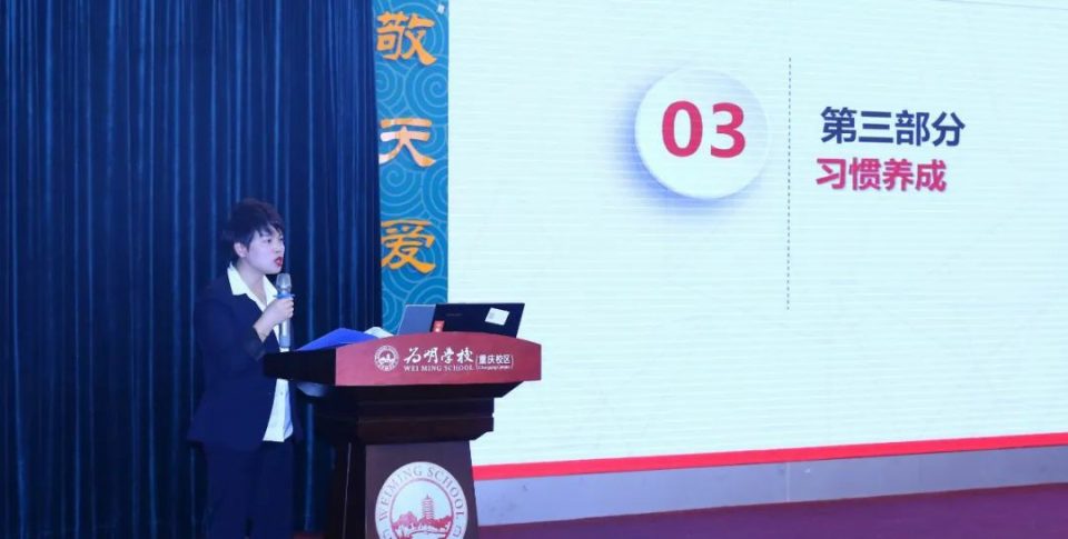 初中部冉洪雨老师以《时间酿酒 余味生花》为题交流了班级管理经验,她从“筑专业之基”“破困顿之局”“蓄成长之力”三个维度展开,讲述了班主任应具备的基本能力和专业着力点,并分享了如何理清工作思路,提高工作效率,寻找成长契机等技巧。
